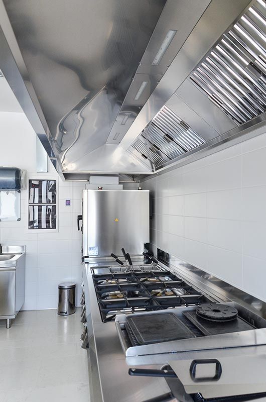 L’impianto di aspirazione è stato realizzato con una cappa compensata e riscaldata così da garantire un ambiente cucina con temperature e flussi d’aria ben controllati. Inoltre in cucina c’è un grosso camino con aspirazione naturale per la cottura della carne alla brace, altro piatto importante nel menù del Tre Ponti, e dovevamo garantire che il fumo della brace non venisse poi risucchiato dall’impianto di aspirazione della cucina provocando fumo e fuliggine all’interno della stessa.