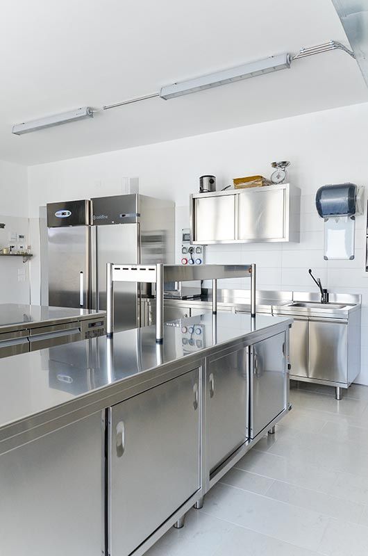 Nei vari piani di lavoro lungo le pareti trovano posto molte altre piccole attrezzature quali l’affettatrice, la sottovuoto, il microonde, ecc.
